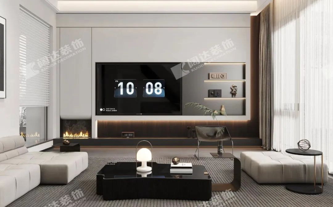 客廳電視背景墻運用簡約、當代的手法去布局,借以保持空間的質感,外表平靜,卻承載了生活里的豐富。像是藝術家康定斯基在畫布上自由地發揮想象空間。