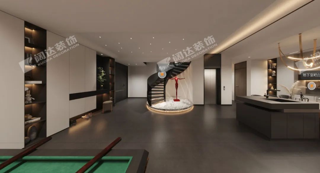 地下室入戶玄關:從地下車庫進入室內,儲物柜與換鞋區,被精心地設計成一處自然景觀,搭配星空頂,讓家更添藝術氣息與夢幻感,鋼結構的旋轉樓梯也保證了地下室的通透性和呼吸度。“回歸本真安寧的生活,從家開始。”