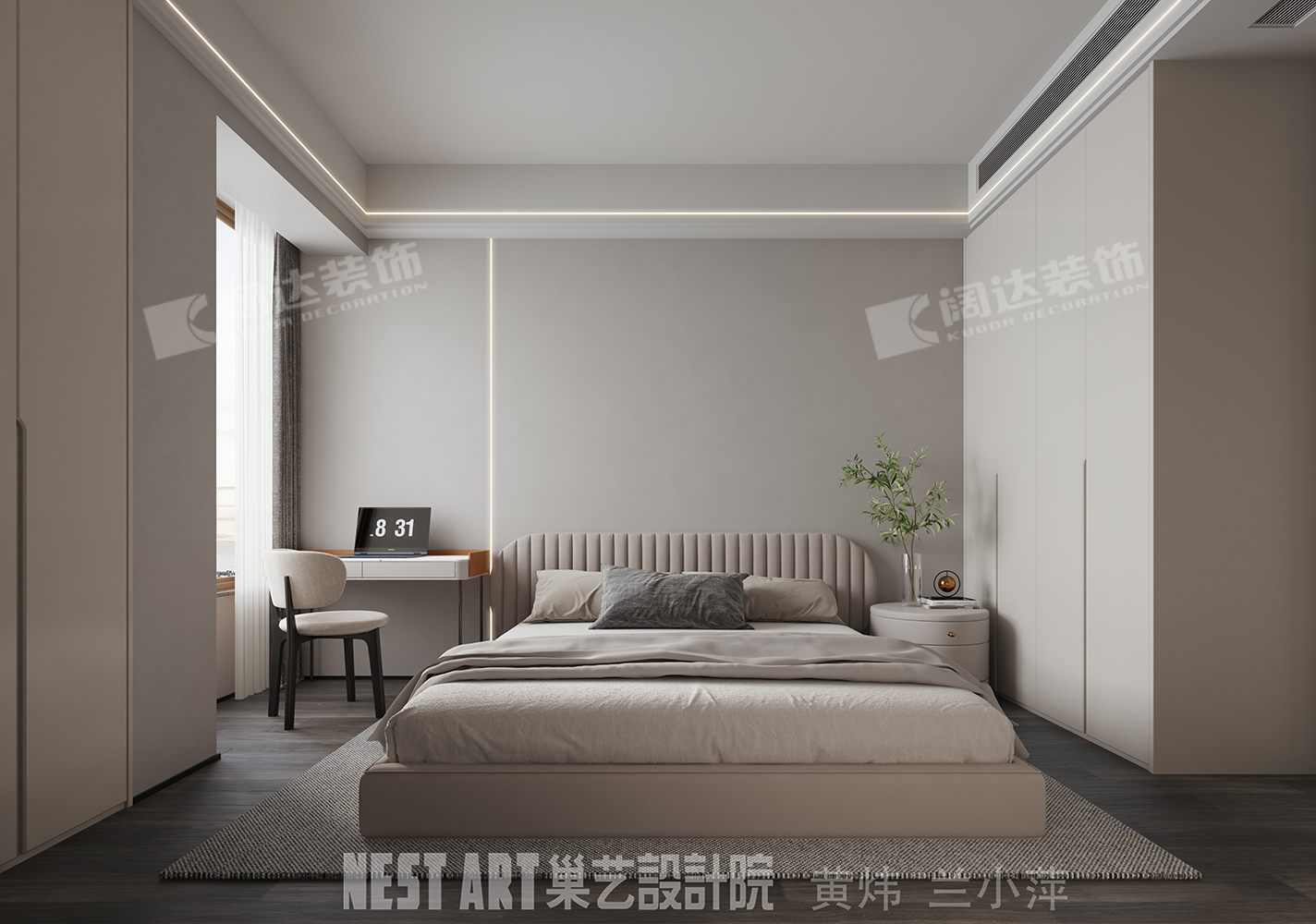 設計師在設計時,將主臥劃分成睡眠區和衣帽間。將主臥的靠窗部位做成睡眠區,把床頭背景墻的位置用造型調平,將邊角位置做成了衣帽間,增加了衣柜及儲物量,調整整個臥室空間的方正性,從而大大利用整體空間。